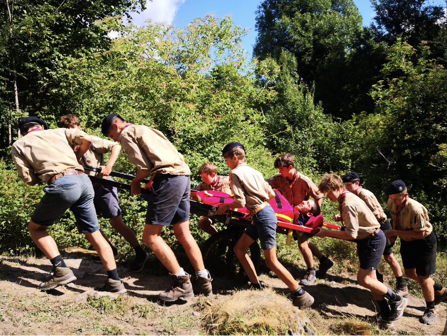 S’ensuivit un temps de formation des scouts au secours en montagne et à l'hélitreuillage : brancardage, sanglage, manipulation de la dérive anti-rotation (pour contrer le souffle de l’hélicoptère). Cependant, certains théâtres d’intervention sont incompatibles avec une évacuation par les airs. Nous avons donc appris à évacuer un blessé grâce à un brancard aménagé d’une roue crantée.
